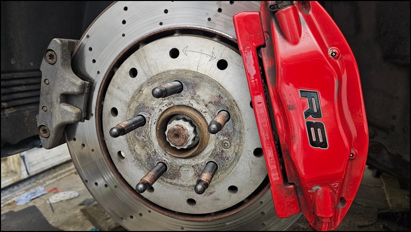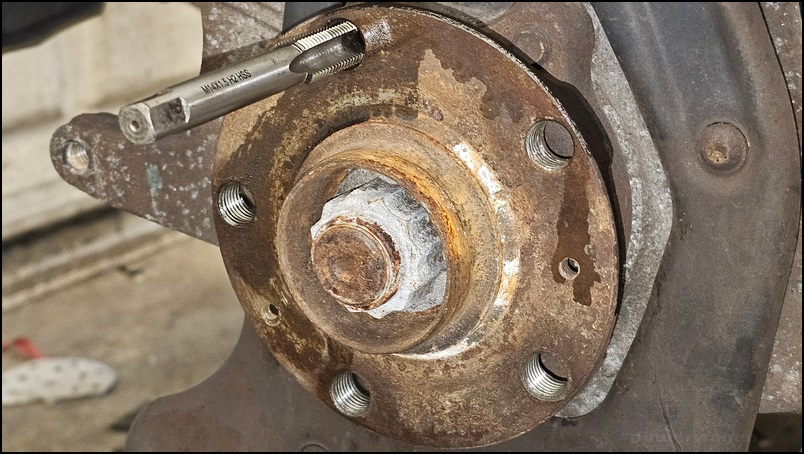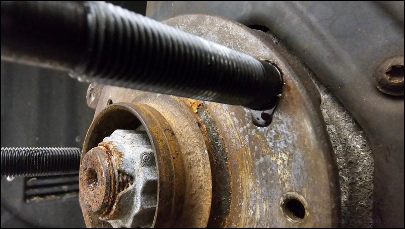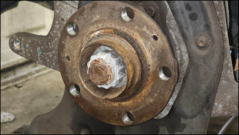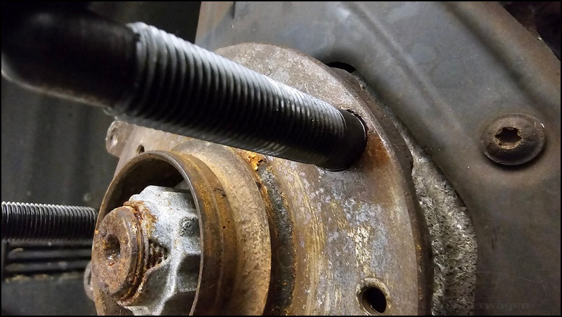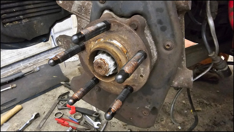 Studs fitted. Should you run anti-seize grease? Well, I change wheels often and I don’t want the nuts galling on the thread, so it’s a must for me. Yes, you need to drop the torque you nip the nuts up to slightly, but I had the lubed studs on the Golf for eight years with no failures, sticking nuts or snapped studs.