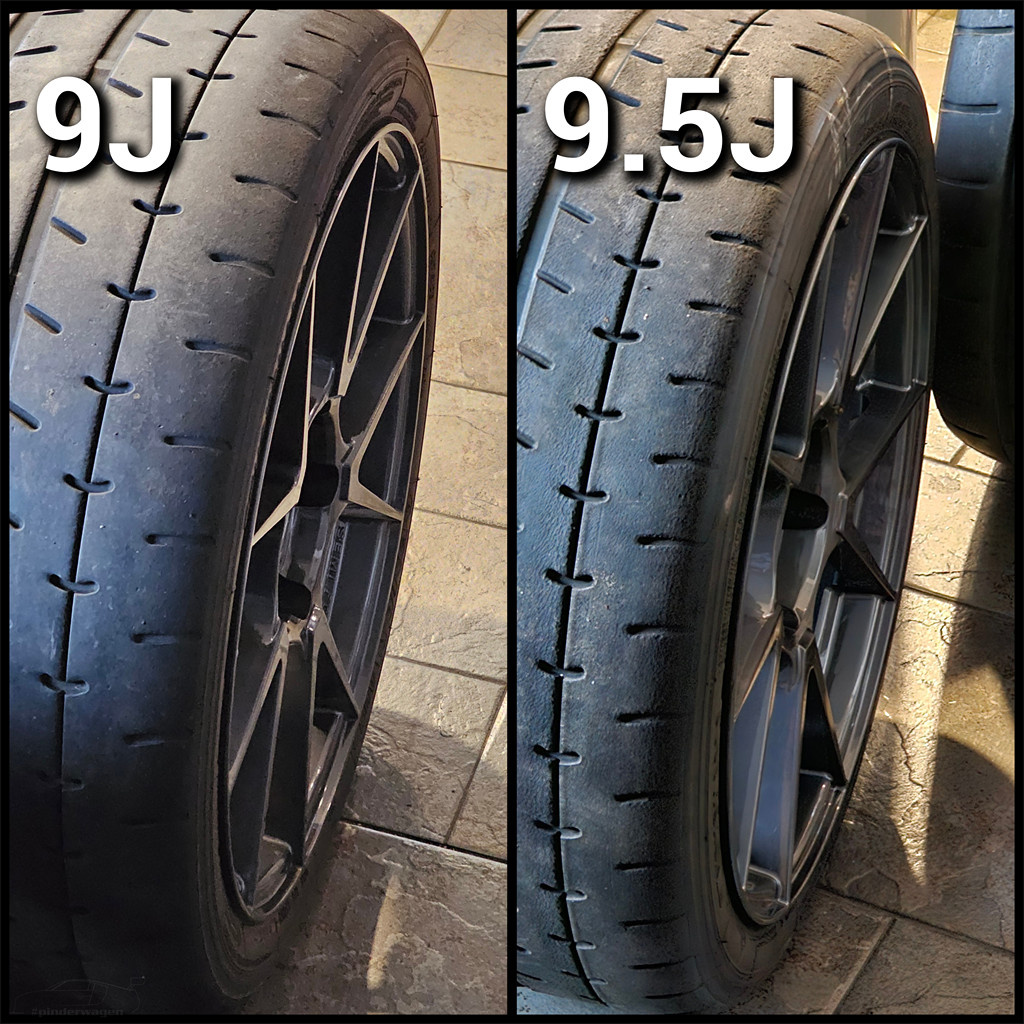 With 255/35R18 A052’s you can see the sidewall on the 9.5J has that slight ‘stretch’ which translates to a noticeably sharper turn in. Whilst the A052 are superb track tyres, the sidewall is a bit on the soft side compared to Direzzas for example. On the 9J, they were rolling over a bit more than ideal and I could feel that from behind the wheel. The wider rim gives that little bit more support and whilst the soft sidewall is still there, initial turn-in is improved and mid corner understeer slightly reduced.
